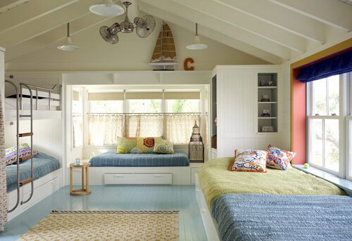 蓝、黄色的榻榻米沙发,使整体布局难免会让低矮空间的阁楼产生压抑感。这个时候,阁楼天窗仿佛的出现格外自然,在拉升空间视觉感的同时,更是让室内明亮无比。